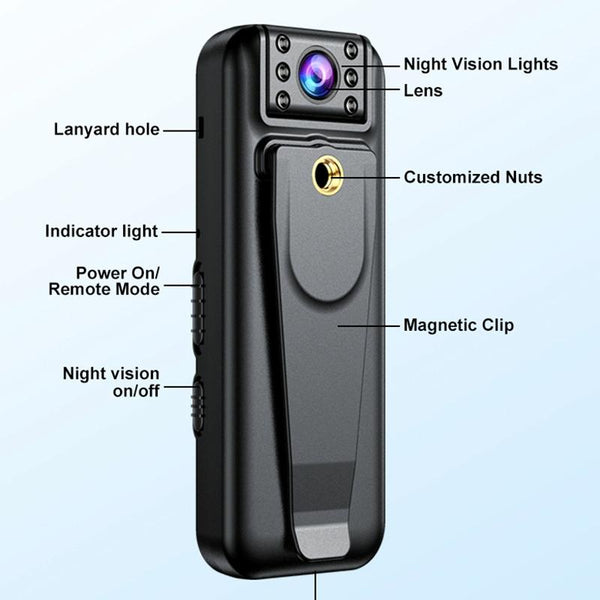 Capture crystal-clear 2K HD video with this discreet, rotating night vision camera. Perfect for on-the-go recording, this compact WiFi-enabled device boasts 180° rotation, capturing everything around you. With six infrared lights, experience superior night vision even in complete darkness. Enjoy up to eight hours of battery life with the built-in 1500mAh battery and loop recording functionality. Expand storage up to 256GB with a TF card (not included) and easily control and view footage via the mobile app. Ideal for outdoor adventures, travel, meetings, or home security. This mini camera measures just 9x3.6x1.8cm and weighs a mere 62g.