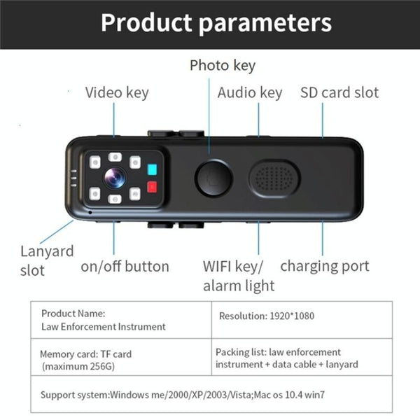 Equipped with infrared night vision, this body camera ensures clear footage even in low-light conditions, with an illumination distance of up to 5 metres. The 90° diagonal viewing angle captures a wide field of view, while the built-in microphone records high-quality audio. A robust back clip and lanyard provide flexible mounting options, allowing you to wear it on your chest, attach it to clothing, bags, or belts, or even use it with a bracket as a webcam.