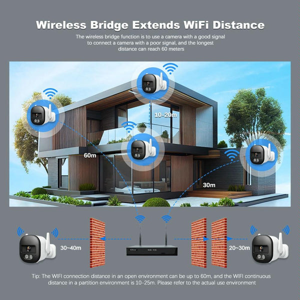 Easy to set up and install, this wireless system features a WiFi bridge mode with a range of up to 60 metres. The NVR supports two-way audio, allowing you to communicate remotely, and offers multiple recording modes, including scheduled and alarm-triggered recording. The system includes all necessary power adapters, screws, and network cable for quick and straightforward installation.