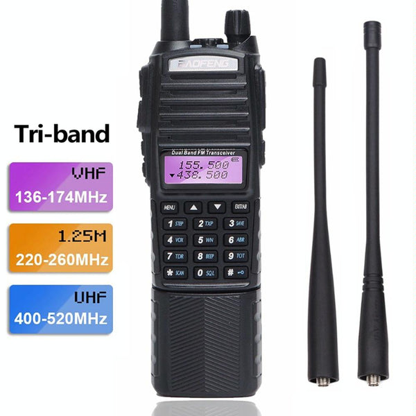1.Tri-band walkie talkie, frequency range in 136-174MHz/220-260MHz/400-520MHz supporting both wide and narrowband with 2.5kHz steps.