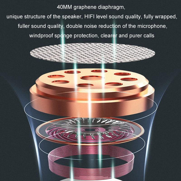 6. 40MM graphene diaphragm, unique structure of the speaker, HIFI level sound quality, fully wrapped, fuller sound quality, double noise reduction of the microphone, windproof sponge protection, clearer and purer calls