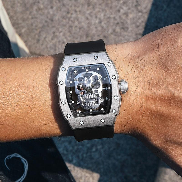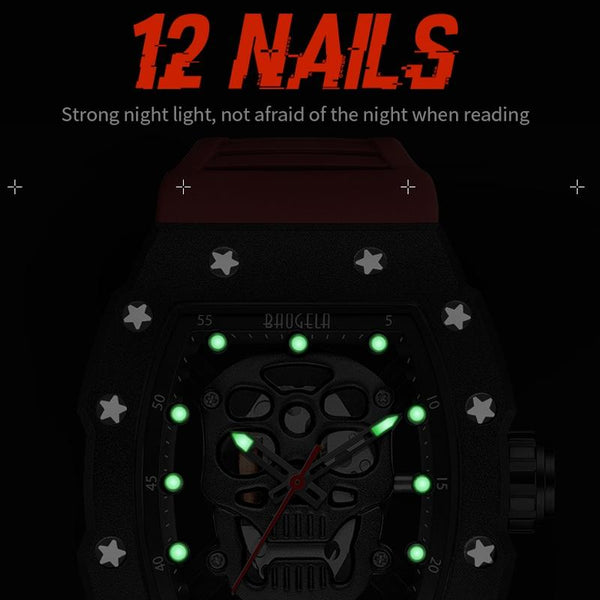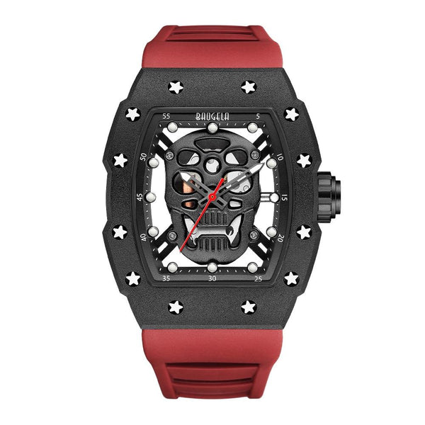 BAOGELA 224141 Hollow Skull Luminous Sports 304 Stainless Steel Silicone Men Watch(Black Shell Black Face Red Belt)