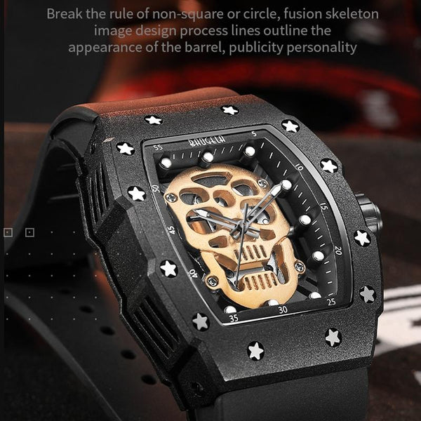 BAOGELA 224141 Hollow Skull Luminous Sports 304 Stainless Steel Silicone Men Watch(Black Shell Rose Face Black Belt)