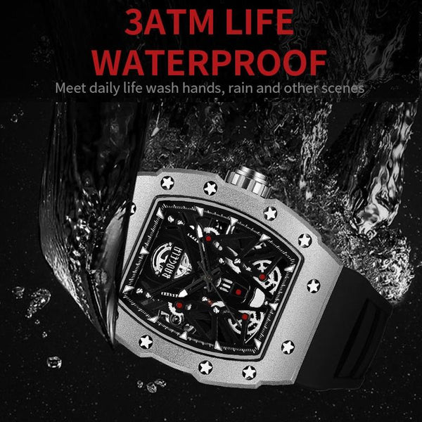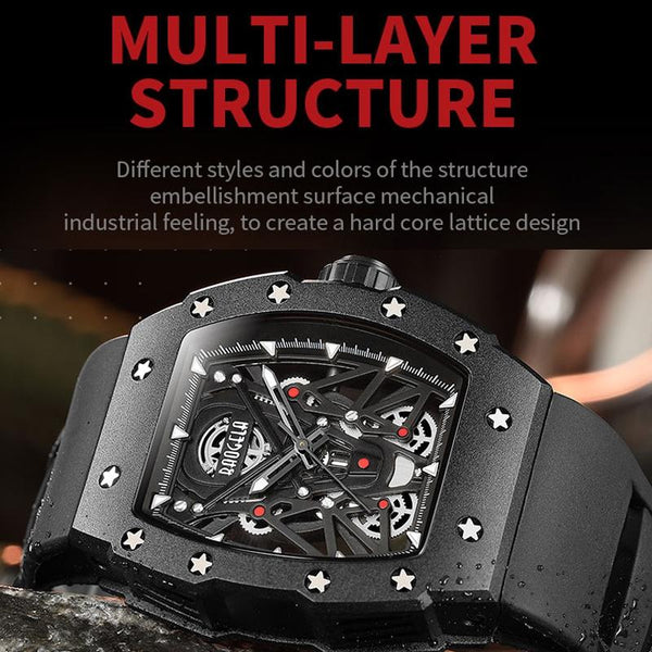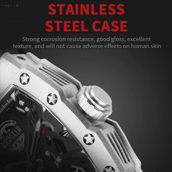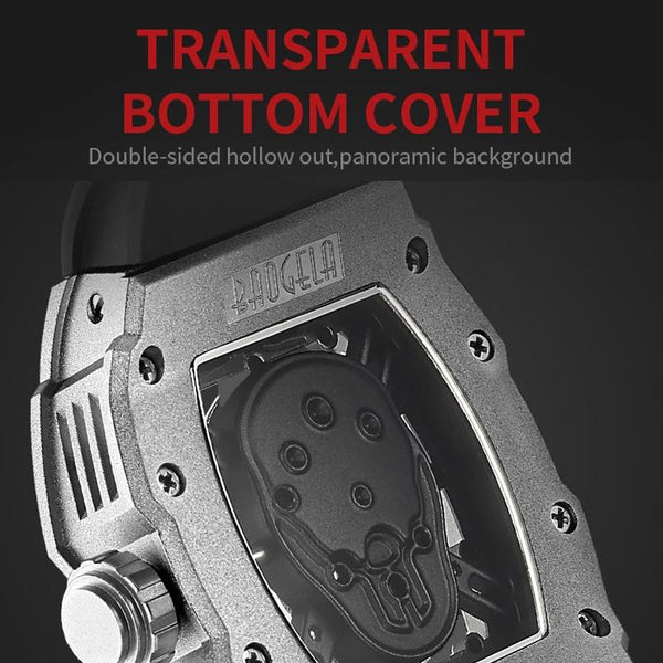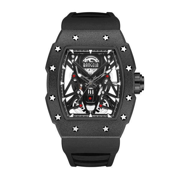BAOGELA 224145 Barrel Skeleton Waterproof Sports Stainless Steel Silicone Men Watch(Black Shell Black Belt)