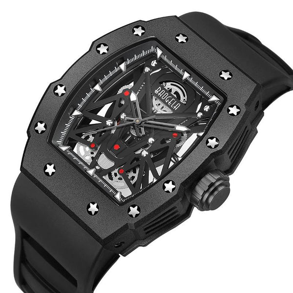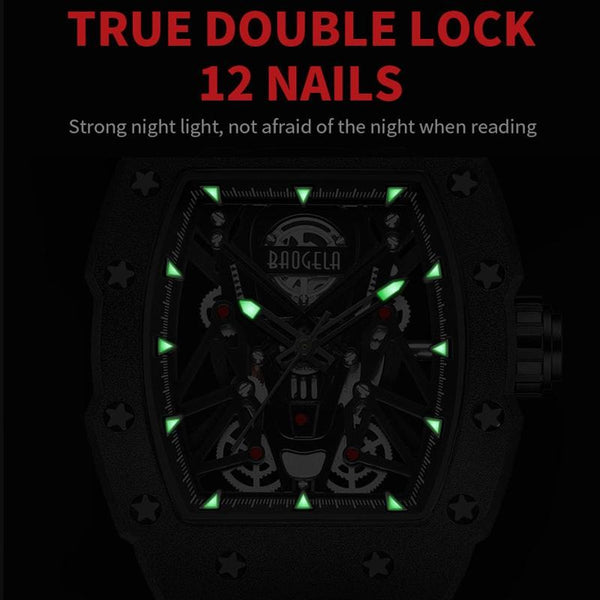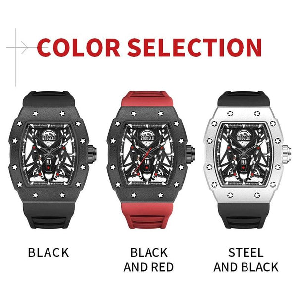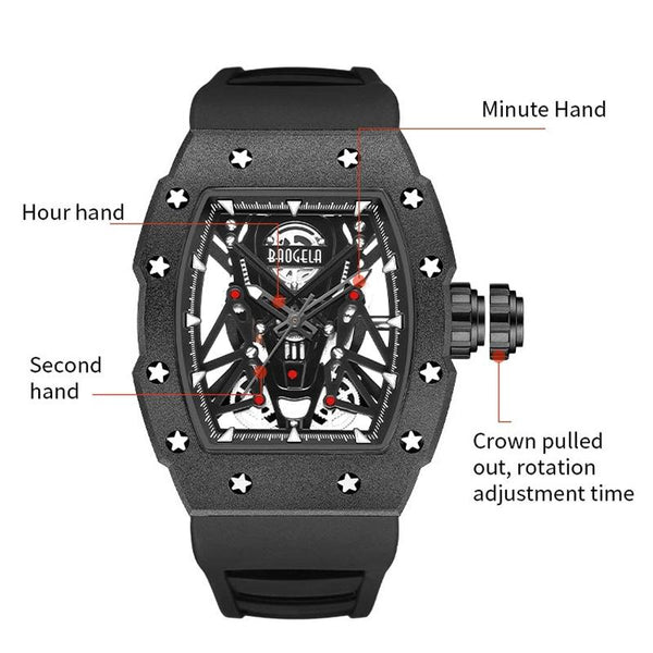 BAOGELA 224145 Barrel Skeleton Waterproof Sports Stainless Steel Silicone Men Watch(Black Shell Red Belt)