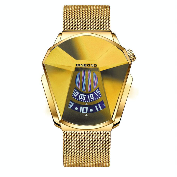 BINBOND 01 Men Locomotive Concept Diamond Dial Quartz Watch(Gold Mash Full Gold Golden Surface)