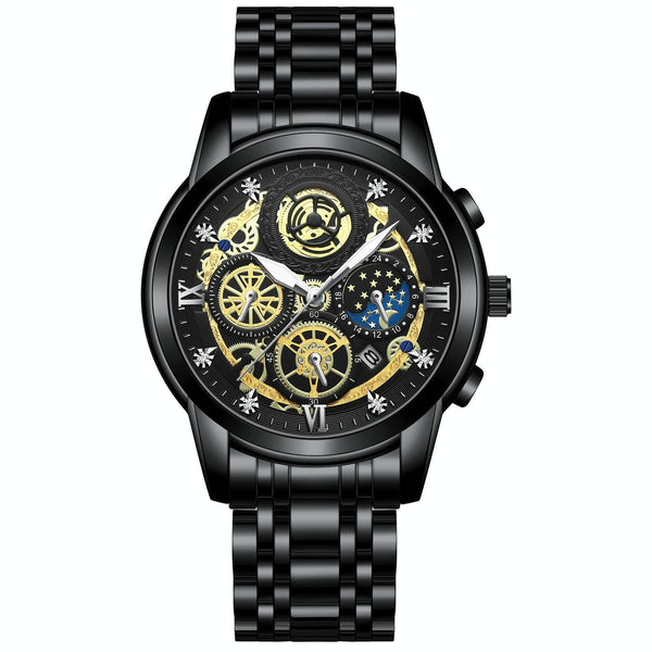 BINBOND 4010 Multifunctional Waterproof Hollowed Luminous Quartz Watch(Black Steel Black Surface)