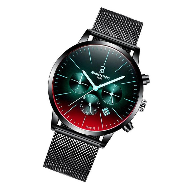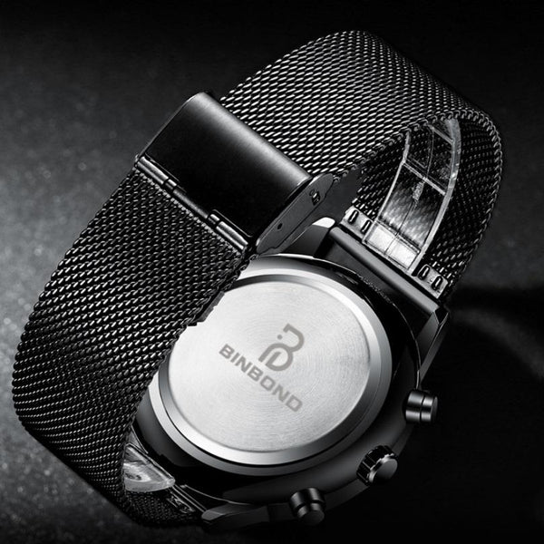 BINBOND B0135 Men Ultra-thin Three-eye Six-pin Multi-function Symphony Sports Watch(Black Mash Black Surface)