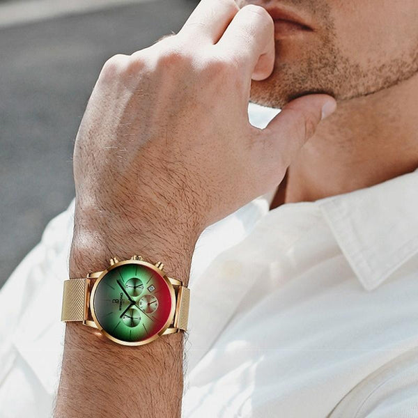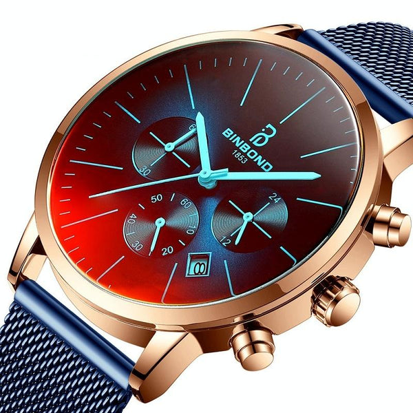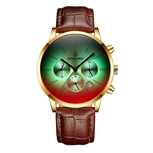 BINBOND B0135 Men Ultra-thin Three-eye Six-pin Multi-function Symphony Sports Watch(Brown Leather Gold Shell Gold Surface)