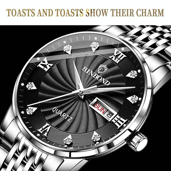 BINBOND B3034 Diamond 30m Waterproof Business Watch Men's Butterfly Buckle Luminous Quartz Watch(Inter-gold-Gold)