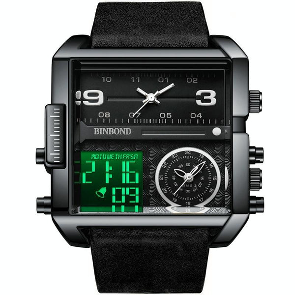 BINBOND B3332 Square Multifunctional Sports Quartz Waterproof Watch(Black Leather-Black-Black-White)