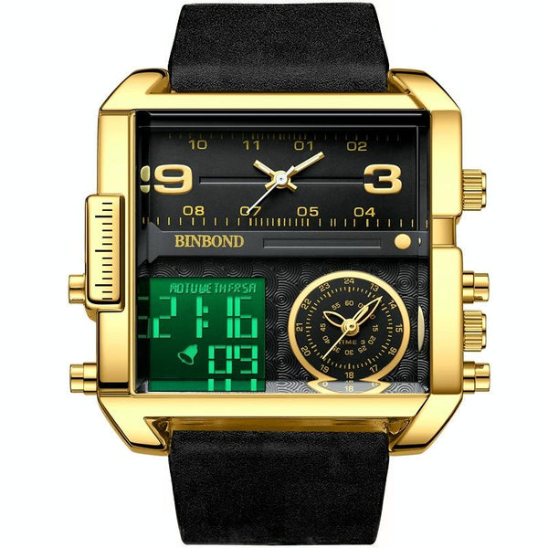 BINBOND B3332 Square Multifunctional Sports Quartz Waterproof Watch(Black Leather-Full-gold-Black)