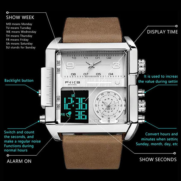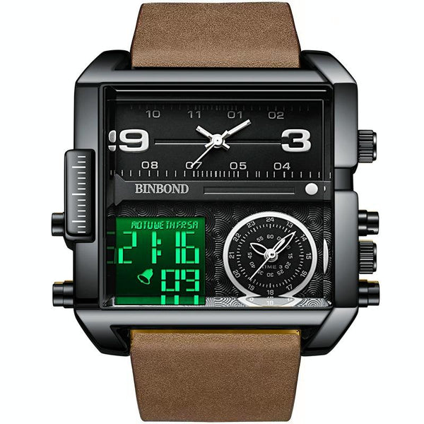 BINBOND B3332 Square Multifunctional Sports Quartz Waterproof Watch(Brown Leather-Black-Black)