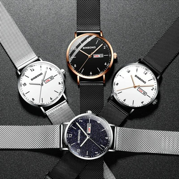 BINBOND B3820 30M Waterproof Ultra-thin Quartz Luminous Starry Watch, Color: Black Leather-Rose Gold-White