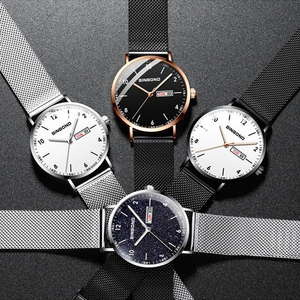 BINBOND B3820 30M Waterproof Ultra-thin Quartz Luminous Starry Watch, Color: Black Net-Rose Gold-White