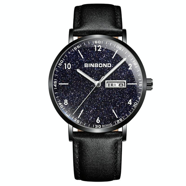 BINBOND B3820 Men Simple Luminous Quartz Watch Student Trendstarry Starry Sky Pattern Watch(Black Leather Black Shell White Nails)