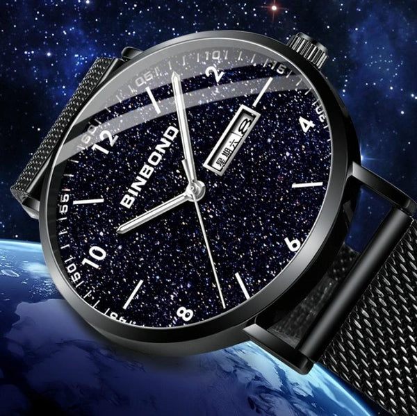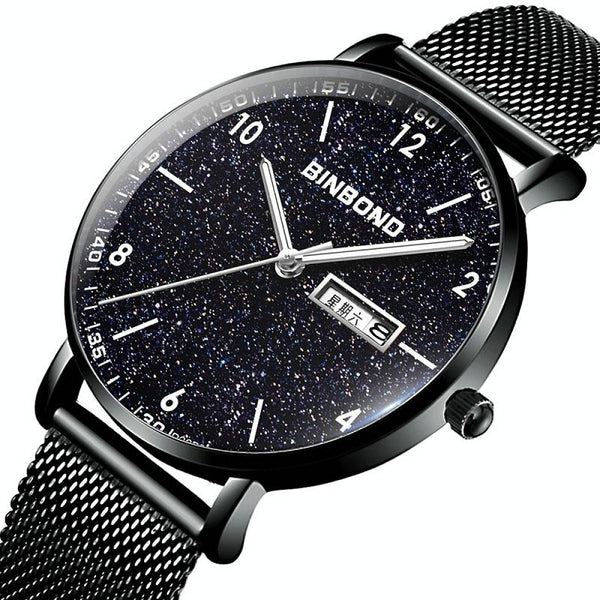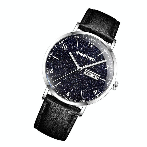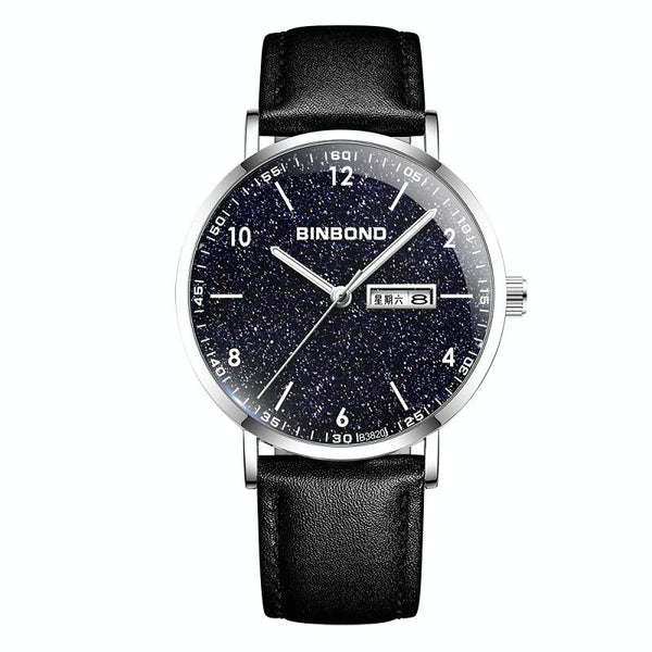 BINBOND B3820 Men Simple Luminous Quartz Watch Student Trendstarry Starry Sky Pattern Watch(Black Leather White Shell White Nails)