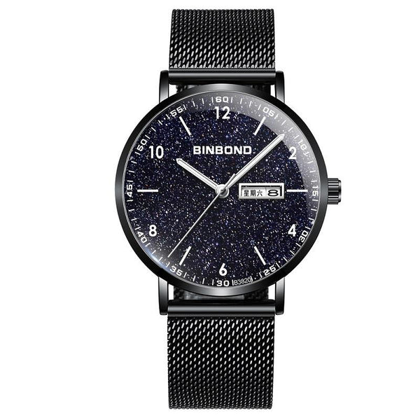 BINBOND B3820 Men Simple Luminous Quartz Watch Student Trendstarry Starry Sky Pattern Watch(Black Mash Black Shell White Nails)