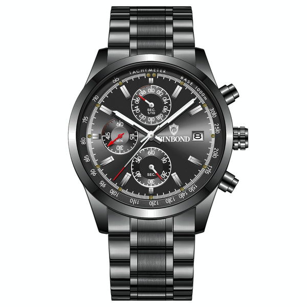 BINBOND B6022 30m Waterproof Luminous Multifunctional Quartz Watch, Color: Black Steel-Black