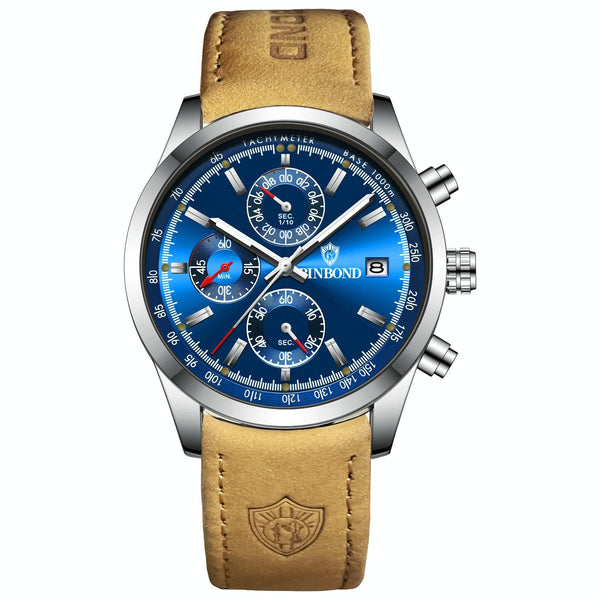 BINBOND B6022 30m Waterproof Luminous Multifunctional Quartz Watch, Color: Leather-White Steel-Blue