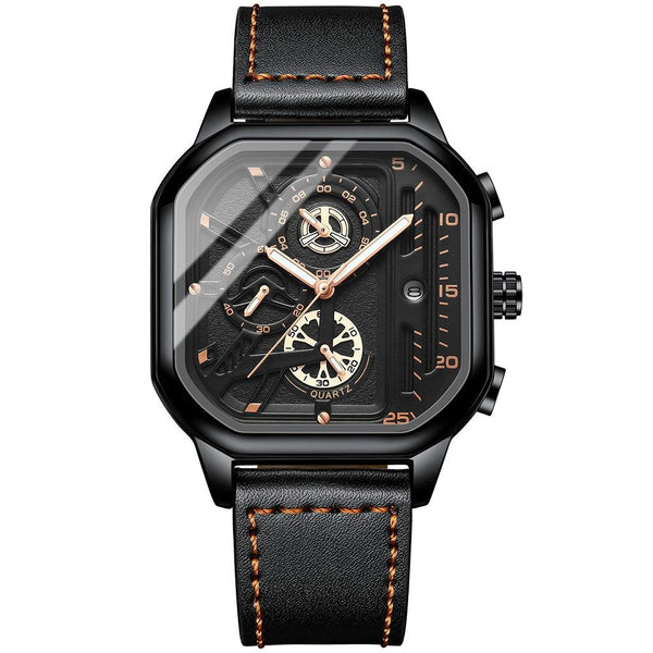 BINBOND B6577 30M Waterproof Luminous Square Quartz Watch, Color: Black Leather-Black-Rose Gold