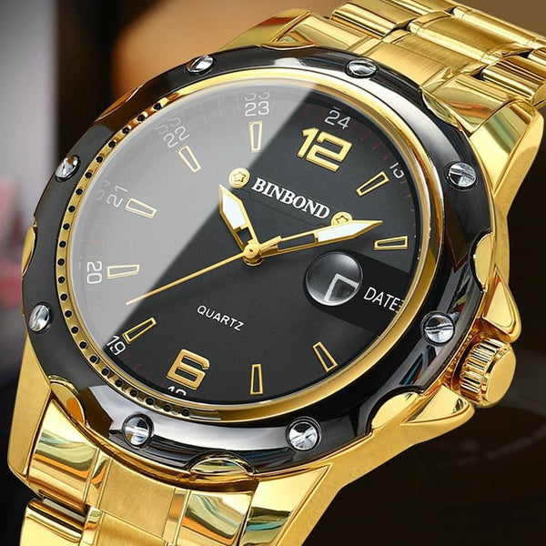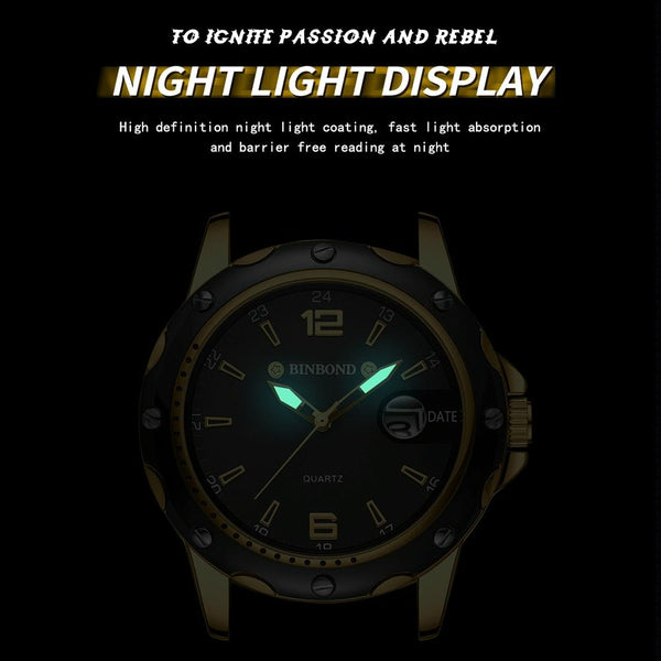 BINBOND B9696 Outdoor Calendar Luminous Waterproof Quartz Watch, Color: Full Gold-Black-Gold Nail