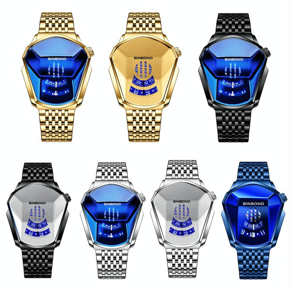 BINBOND Locomotive Concept Steel Belt Watch Men Live Black Technology Watch(Black Stee Blue Face)