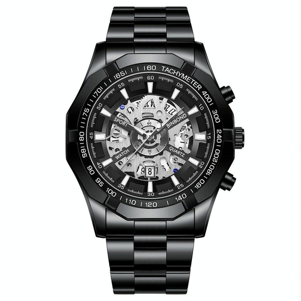 BINBOND S033 Hollowed Mechanical 30m Waterproof Luminous Quartz Watch, Color: Black Steel-Black-White