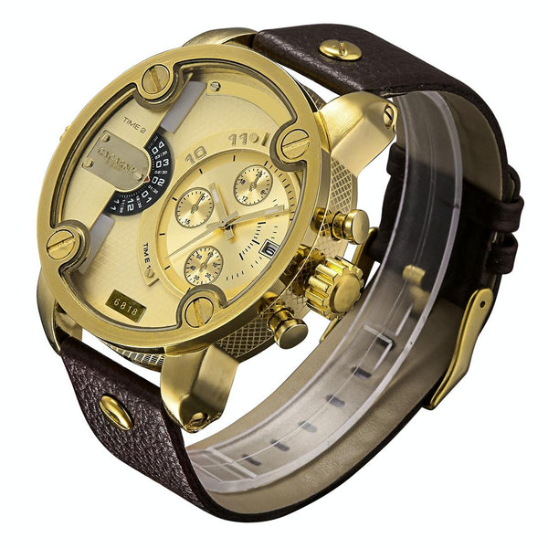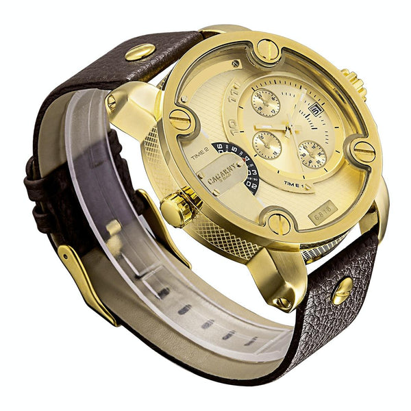 CAGARNY 6818 Fashionable DZ Style Large Dial Dual Clock Quartz Movement Sport Wrist Watch with Leather Band & Calendar Function for Men(Brown Band Gold Case)