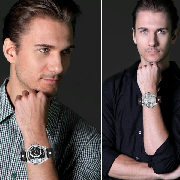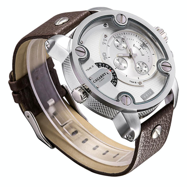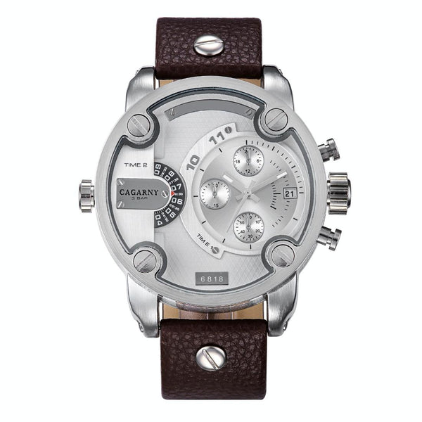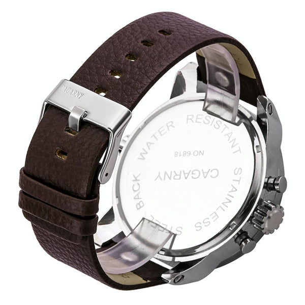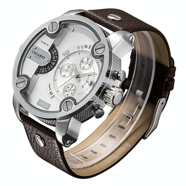 CAGARNY 6818 Fashionable DZ Style Large Dial Dual Clock Quartz Movement Sport Wrist Watch with Leather Band & Calendar Function for Men(Brown Band Silver Case)