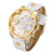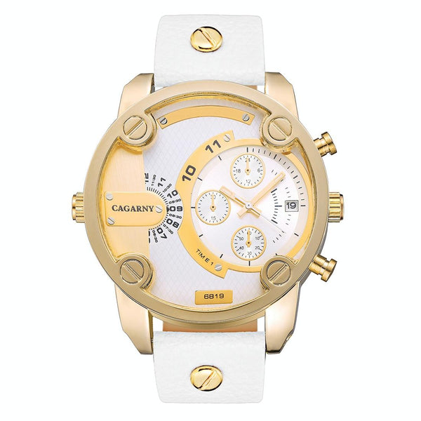 CAGARNY 6819 Fashionable Multifunctional Dual Time Zone Quartz Business Sport Wrist Watch with Leather Band & GMT Time & Calendar & Luminous Display for Men(Gold Case White Strap)