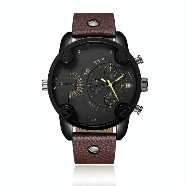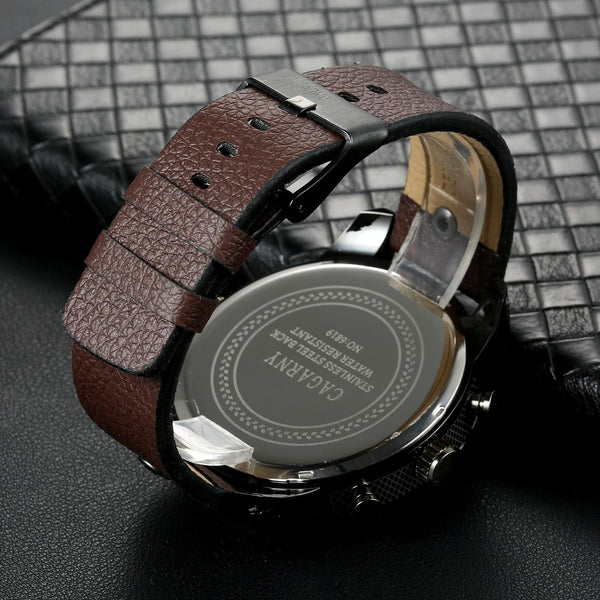 CAGARNY 6819 Multifunctional Dual Time Zone Quartz Business Sport Watch for Men(Black Shell Black Surface Brown Leather)