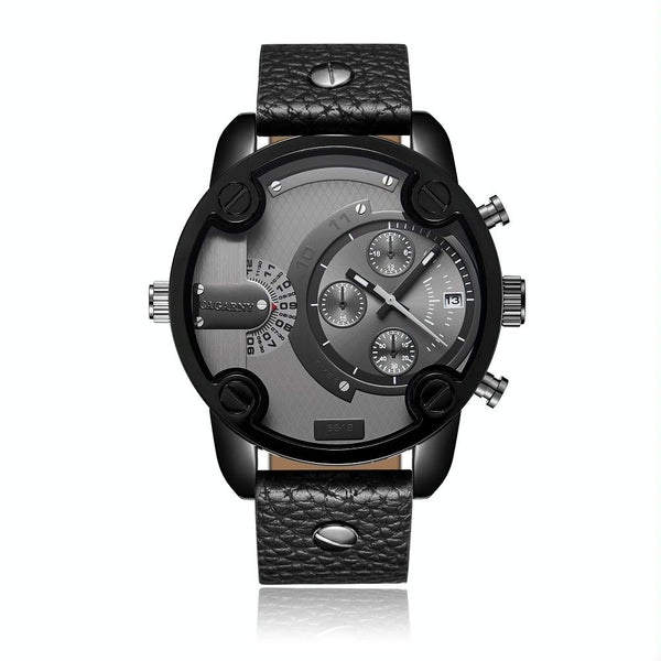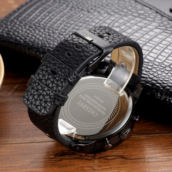 CAGARNY 6819 Multifunctional Dual Time Zone Quartz Business Sport Watch for Men(Black Shell Grey Surface Black Leather)