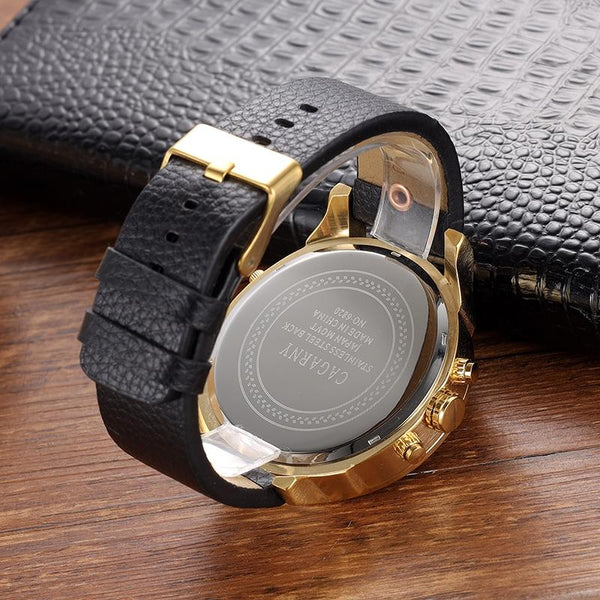 CAGARNY 6820 Round Large Dial Leather Band Quartz Dual Movement Watch For Men(Gold Between Black Band)