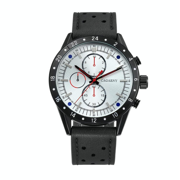 CAGARNY 6828 Fashionable Multifunctional Style Quartz Sport Wrist Watch with Leather Band & GMT Time & Calendar & Luminous Display for Men(Black Window Red Needle)