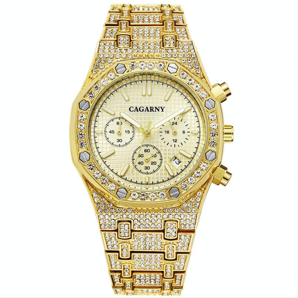 CAGARNY 6881 Diamond-studded Six-needles Guartz Dual Movement Watch Men Stainless Steel Strap Watch (Gold Shell Gold Dial)