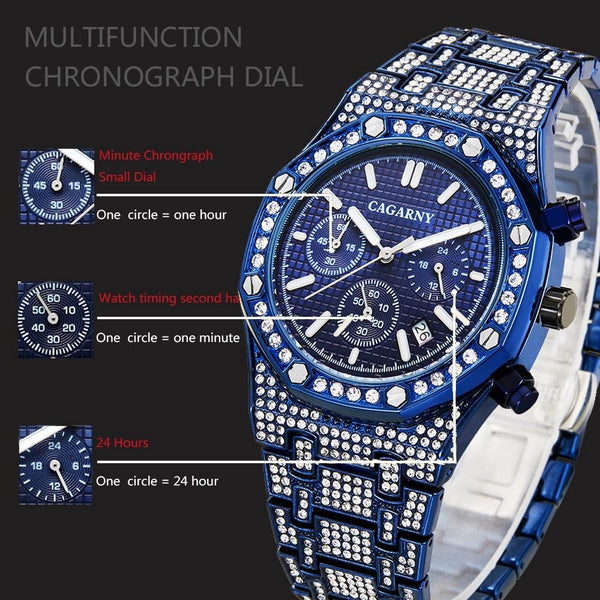CAGARNY 6881 Diamond-studded Six-needles Guartz Dual Movement Watch Men Stainless Steel Strap Watch (Silver Shell Black Dial)