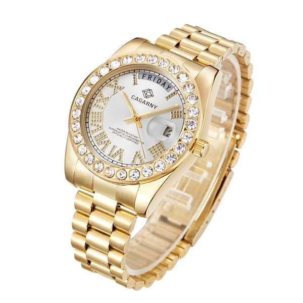 CAGARNY 6886 Diamond-encrusted Roman Numeral Dial Quartz Watch for Men(Gold Shell White Dial)