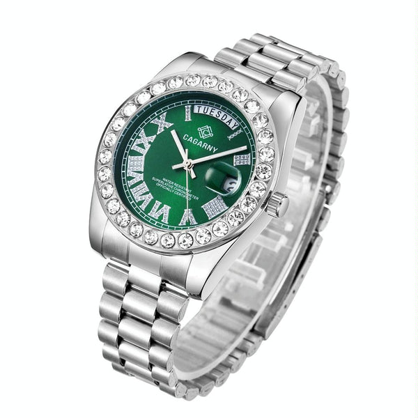 CAGARNY 6886 Diamond-encrusted Roman Numeral Dial Quartz Watch for Men(Silver Shell Green Dial)