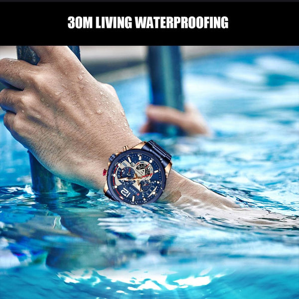 17. Please note: 30 meters waterproof for daily use. It cannot be worn for swimming, bathing, soaking in water, or underwater operations. It can withstand drizzle and small splashes. For a longer life of the watch, avoid contact with corrosive substances