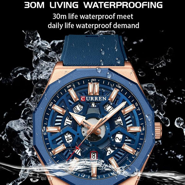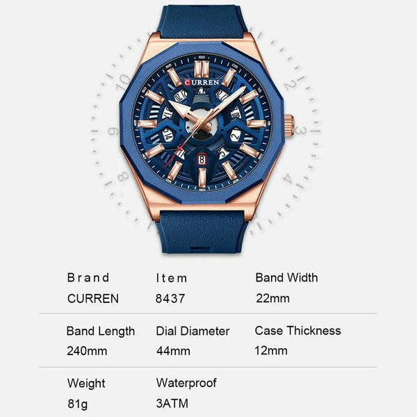Curren 8437 Casual Men Silicone Strap Quartz Watch with Calendar, Color: Rose Blue Blue