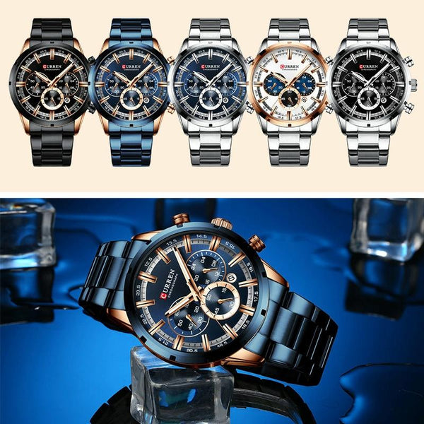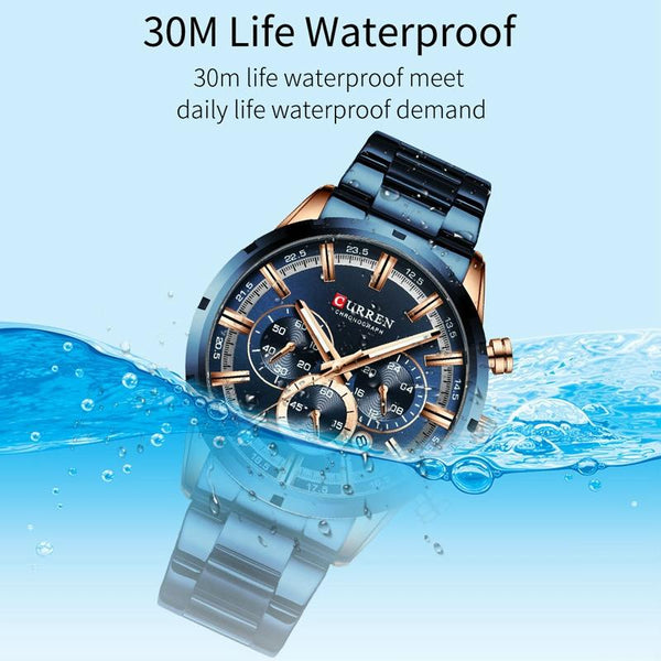Curren M8355 Men Watch Waterproof Quartz Six Stitches Calendar Steel Belt Business Watch(Rose Shell Blue)