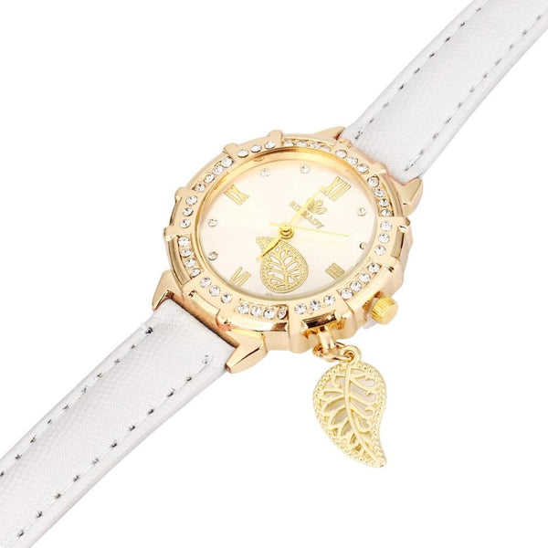 Dial Plated Diamond PU Leather Belt Watch with Leaf Pendant(White)