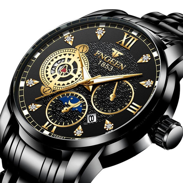 FNGEEN 2166 Men Three-eye Hollow Quartz Watch Student Sports Electronic Watch(Between Gold Black Surface)
