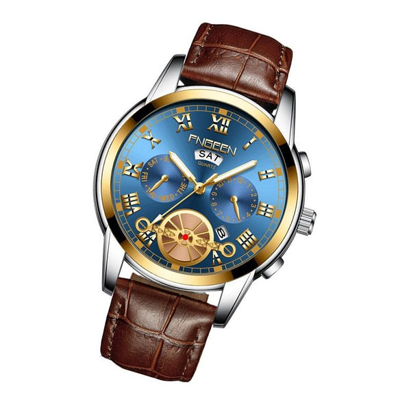 FNGEEN 4001 Men Watch Multi-Function Quartz Watch, Colour: Brown Leather Gold Blue Surface