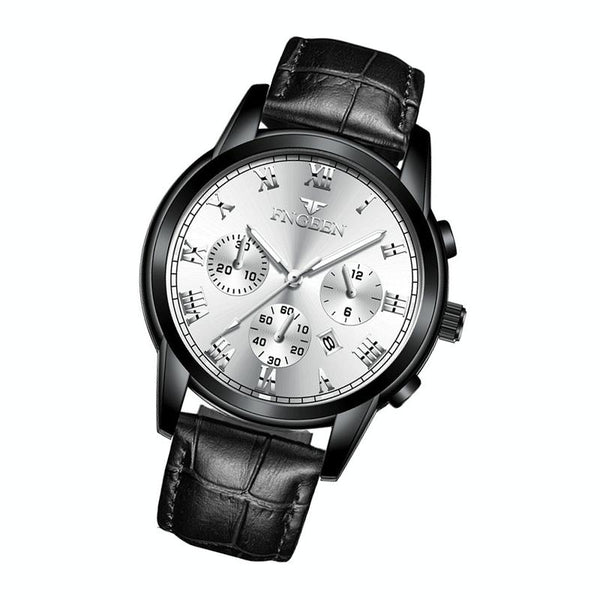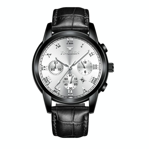 FNGEEN 4006 Men Trendy Waterproof Quartz Watch(Black Leather Black Steel White Surface)