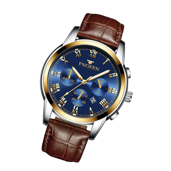 FNGEEN 4006 Men Trendy Waterproof Quartz Watch(Brown Leather Gold Blue Surface)
