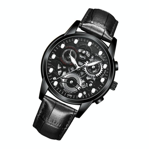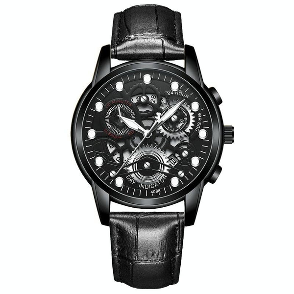 FNGEEN 4088 Men Hollow Quartz Watch Student Waterproof Luminous Watch(All Black Surface White Nails)