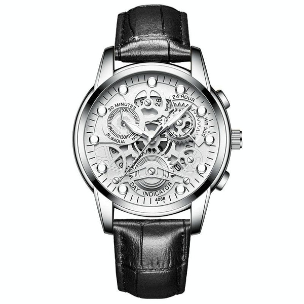 FNGEEN 4088 Men Hollow Quartz Watch Student Waterproof Luminous Watch(Black Leather White Steel White Flour)