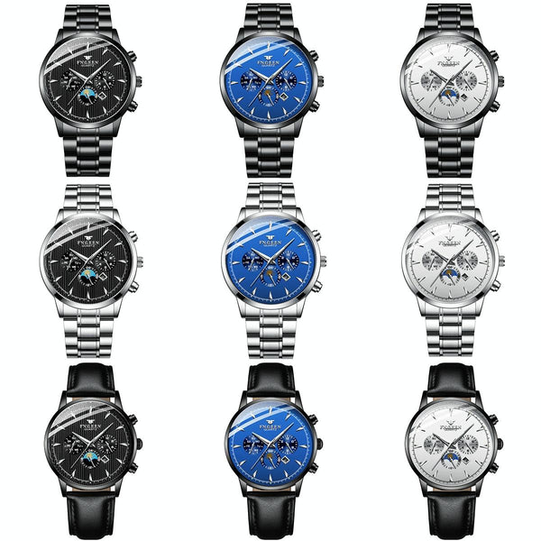 FNGEEN 5781 Multifunction Sports Waterproof Quartz Watch(Black Leather Black Steel Blue Surface)